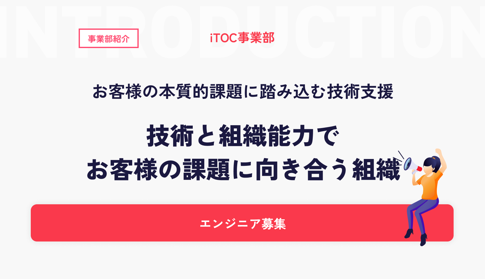 事業部名の「iTOC」は Increasing Technical & Organizational Capabilities の略称です。