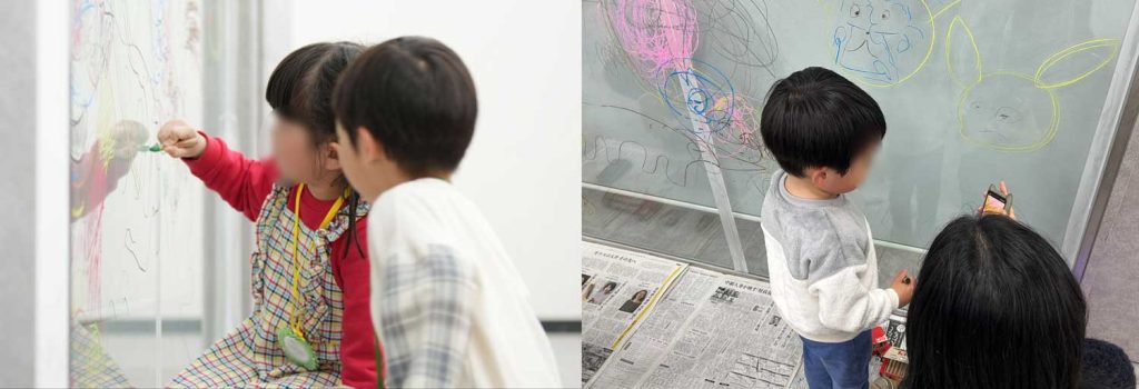 のびのびとはじまった、会議室のガラス壁へのお絵描き