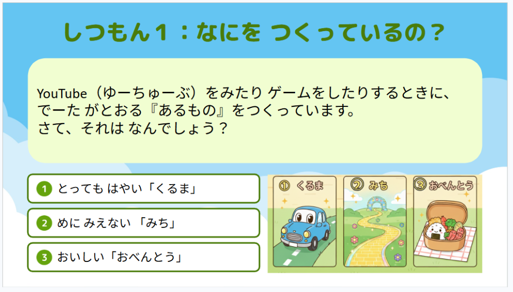 クイズを通して、いつも画面に向かっているパパやママが、実はみんなが楽しく過ごすための「大切な道」を作ったり、「魔法」を使ったりしていることを知りました。