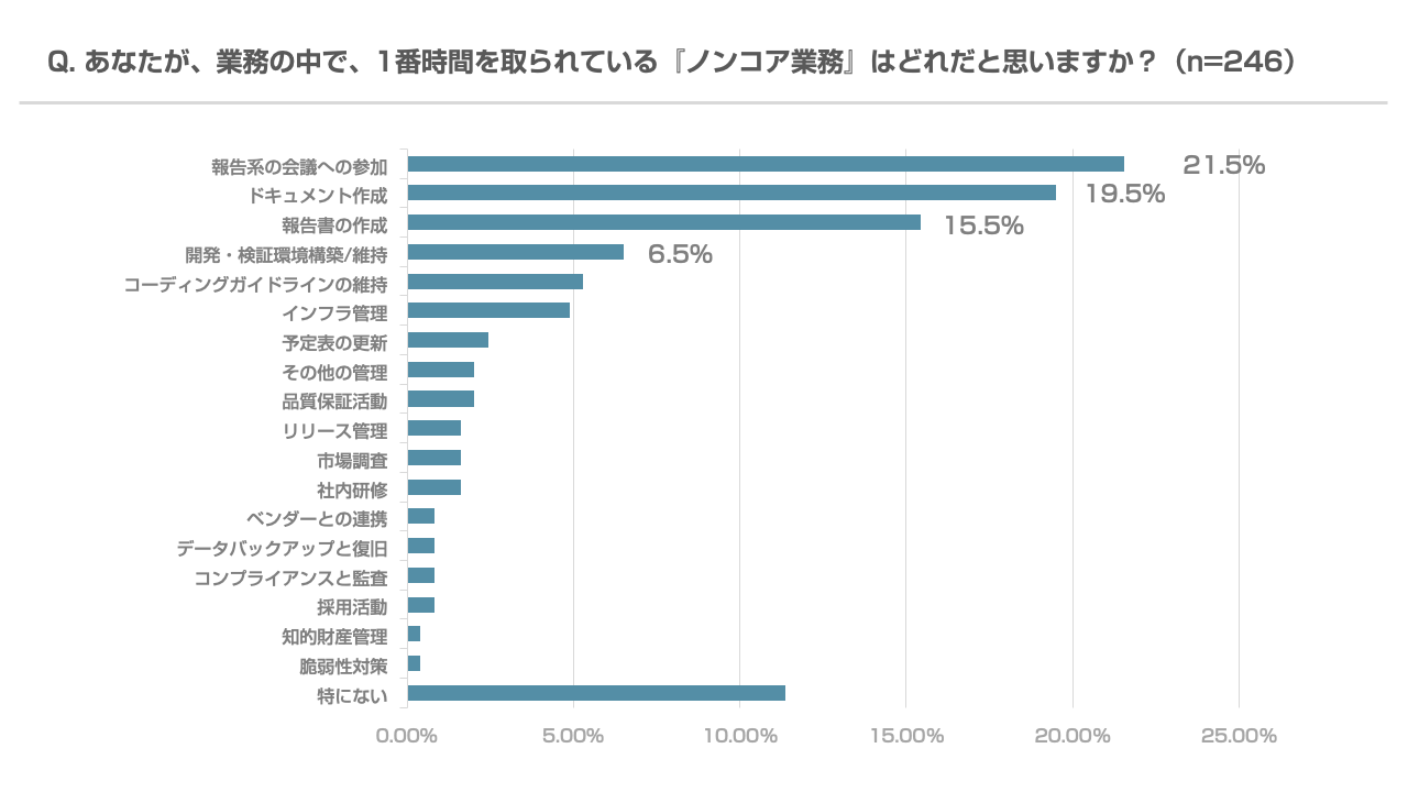 エンジニアが最も時間を取られているノンコア業務は「報告系の会議への参加(21.5%)」「ドキュメントの作成(19.5%)」「報告書の作成(15.5%)」「開発・検証環境の構築(6.5%)」「コーディングガイドラインの維持(5.3%)」が上位という結果でした。