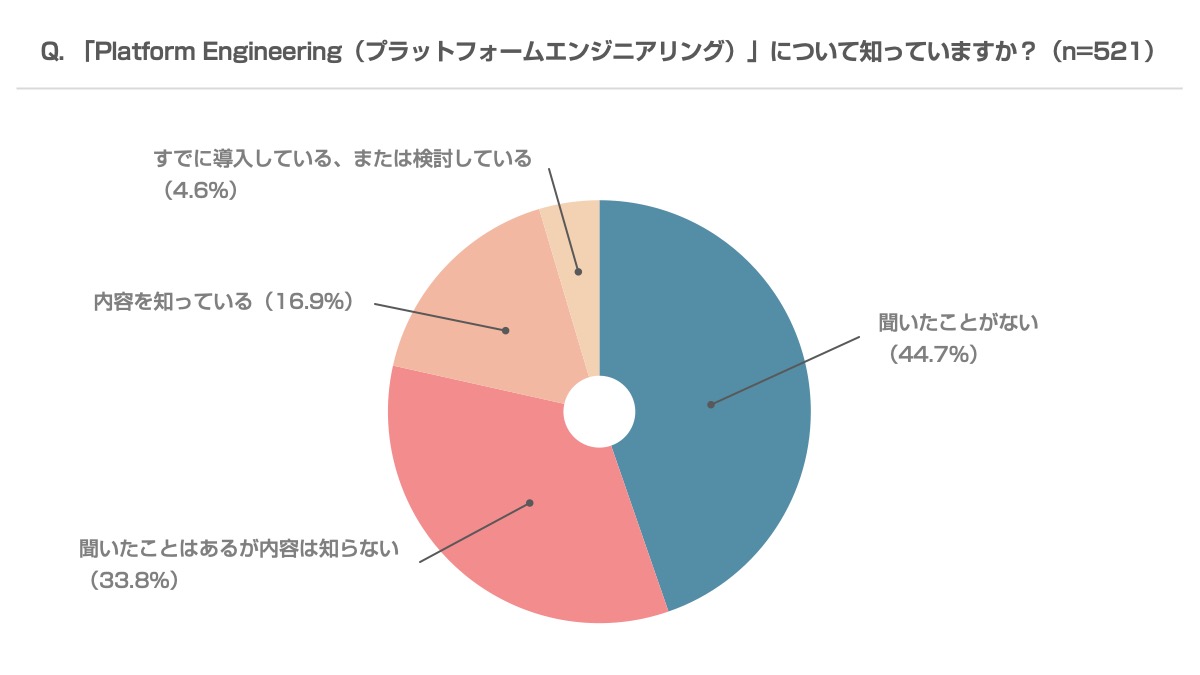 海外では2022年から浸透が加速している「プラットフォームエンジニアリング」については、すでに半数以上が「導入している・検討している」「内容を知っている」「聞いたことはある」と回答するなど、日本でも認知度や理解度が浸透している様子がみて取れる結果となりました。