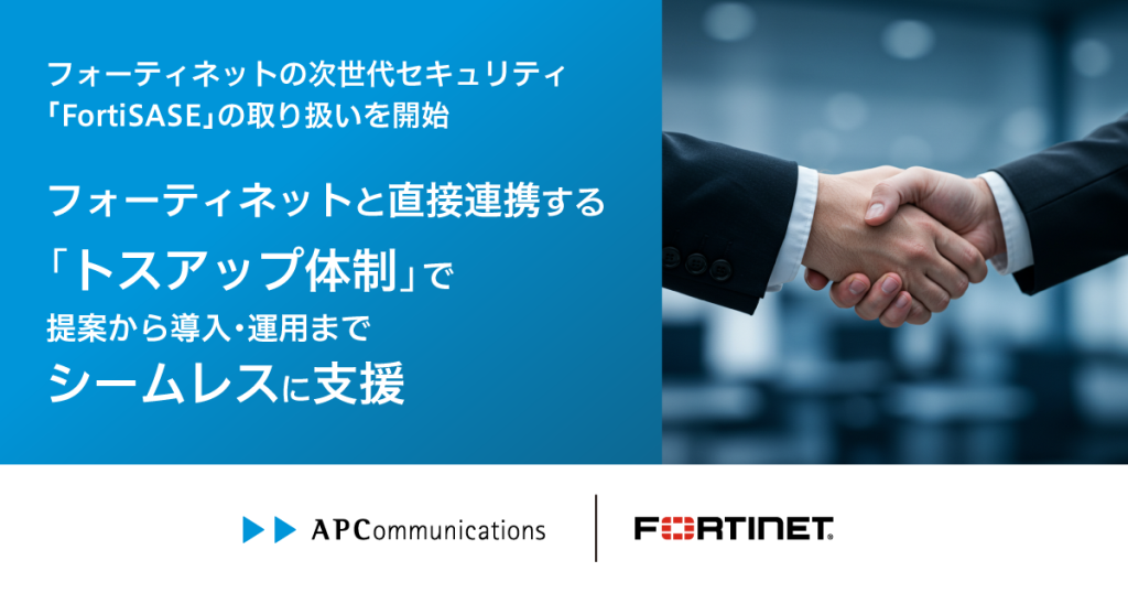 株式会社エーピーコミュニケーションズ(本社:東京都千代田区、代表取締役:内田武志、以下「当社」)は、この度、サイバーセキュリティの世界的リーダーであり、ネットワークとセキュリティの融合を牽引するフォーティネットジャパン合同会社(以下「フォーティネット」)のクラウド型SASE(Secure Access Service Edge ※1)ソリューション「FortiSASE(フォーティサッシー)」の取り扱いを正式に開始しました。
