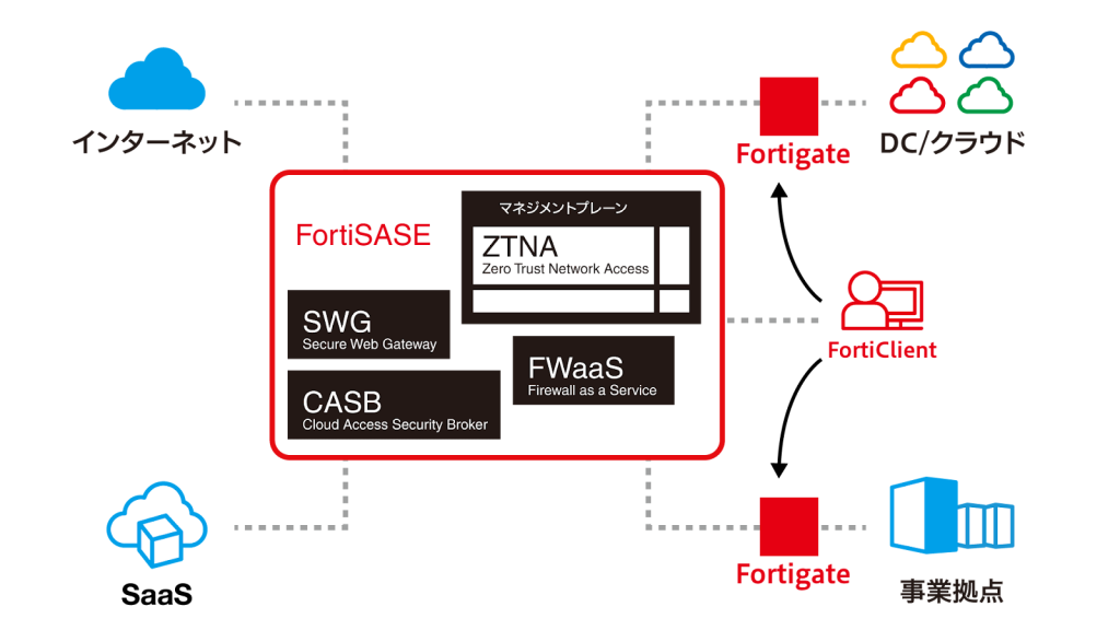 「FortiSASE」は、クラウドベースでセキュリティとネットワーク機能を統合し、場所を問わず安全なアクセスを可能にするソリューションです。セキュリティ機能とネットワーク機能をクラウド上で統合し、安全かつ効率的に社内ネットワークやクラウドアプリケーションへアクセスできる環境を実現します。