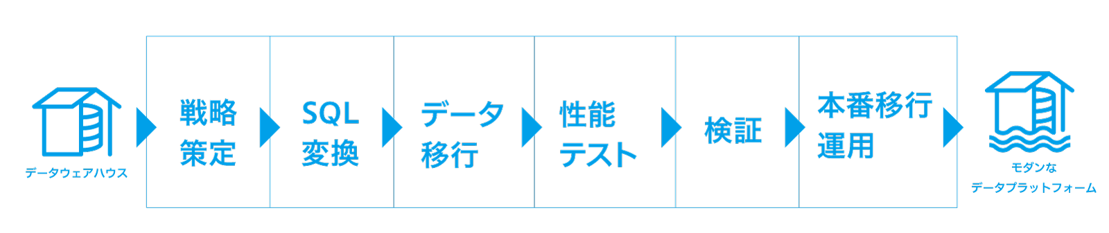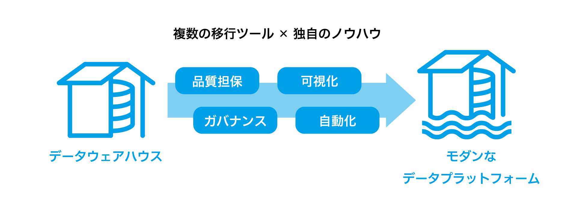 データプラットフォームマイグレーションサービスは、オープンソースツール Lakebridgeをはじめとした複数のマイグレーションツールを採用し、オンプレミスやレガシーなData WarehouseからDatabricksのデータプラットフォームへの移行を、安全・迅速・確実に進める支援を提供します。「可視化」「自動化」「品質保証」「ガバナンス」の流れをワンストップで提供することで、お客さまの現場に負担をかけずに次世代データ活用基盤への移行をスムーズに導きます。